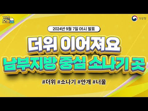 남부지방을 중심으로 늦더위와 대기 불안정으로 인해 소나기가 이어지겠습니다. 경기내륙과 강원내륙에는 산발적인 소나기가 내릴 수 있으며, 경상권 일부는 내일 새벽까지도 소나기가 계속될 전망입니다. 지역별 예상 강수량을 확인하시기 바랍니다.